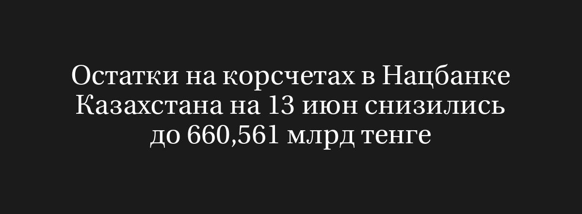 АЛМА-АТА, 16 июня (Рейтер) – По состоянию на 13 июня остатки на корреспондентских счетах банков в Национальном банке Казахстана уменьшились до 660,561 миллиардов тенге, что является снижением по сравнению с 749,073 миллиардами тенге, отмеченными ранее, согласно данным Центрального банка.