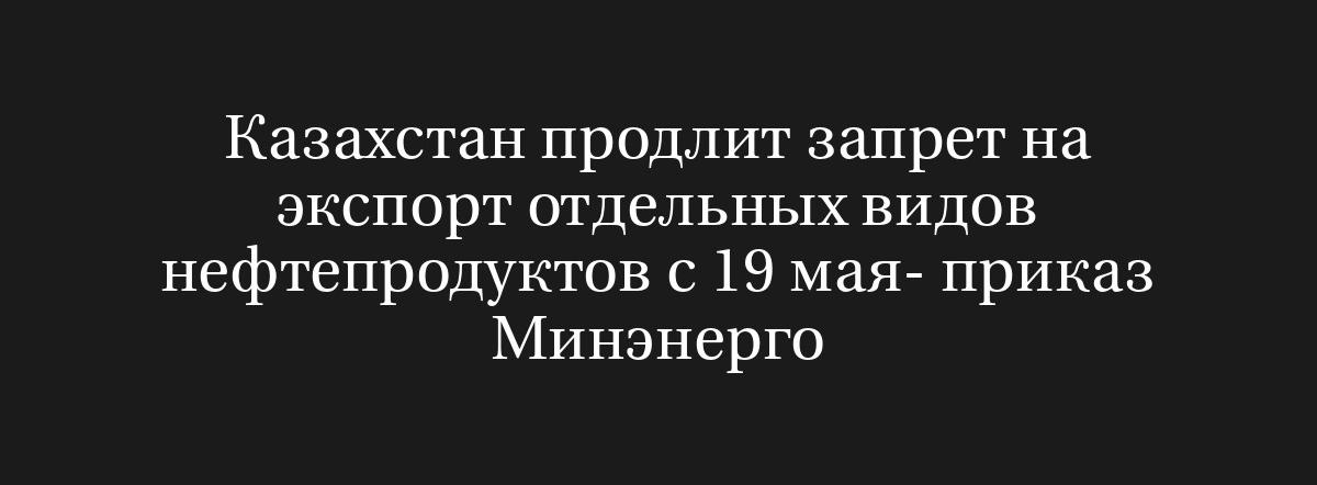 МОСКВА, 12 мая (Рейтер) – Казахстан решит продлить запрет на экспорт моторного топлива и некоторых типов нефтепродуктов на шесть месяцев с 19 мая 2025 года, в том числе для стран, входящих в Евразийский экономический союз (ЕАЭС), как указано в приказе Министерства энергетики.
