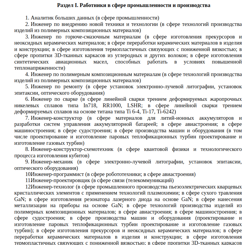 Обновленный перечень профессий Минтруда разделен на две категории: «Работники в сфере промышленности и производства» и «Работники в сфере науки». В разделе научных работников указаны всего две позиции: аналитик больших данных (в области астрофизики и генетики) и квантовый инженер-программист (в сфере квантовой физики и методик коррекции ошибок).