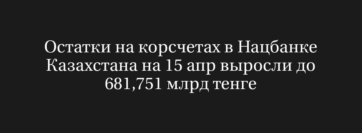 АЛМА-АТА, 16 апреля (Рейтер) – На 15 апреля остатки на корреспондентских счетах банков в Национальном банке Казахстана увеличились до 681,751 миллиарда тенге, в то время как ранее они составляли 528,963 миллиарда тенге, сообщила Центральный банк.
