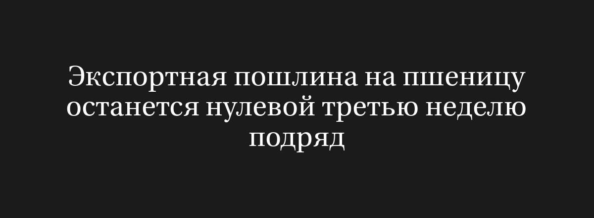 МОСКВА, 18 июля (Рейтер) – На протяжении третьей недели подряд экспортная пошлина на пшеницу останется на уровне ноль, согласно информации, предоставленной Минсельхозом.