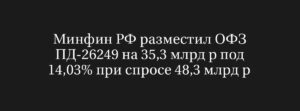 Минфин России успешно разместил ОФЗ ПД-26249 на 35,3 млрд рублей под 14,03% с высоким спросом в 48,3 млрд